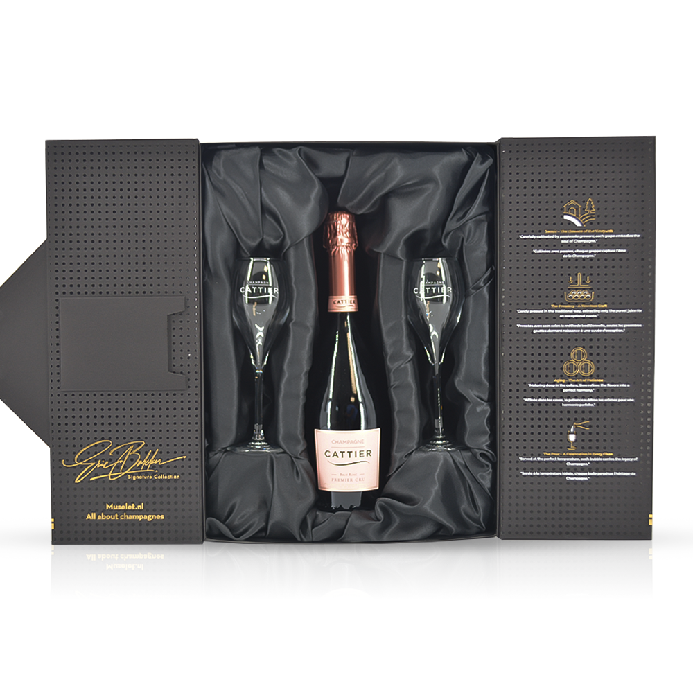 Deze vernieuwde exclusieve geschenkverpakking van Muselet is een waar statement van luxe en elegantie. De mat zwarte doos is afgewerkt met gouden details en subtiele reliëfstructuren, wat zorgt voor een moderne en chique uitstraling. Binnenin is de verpakking gevoerd met satijn, waardoor zowel de fles champagne als de twee bijpassende glazen van het huis stijlvol worden gepresenteerd.