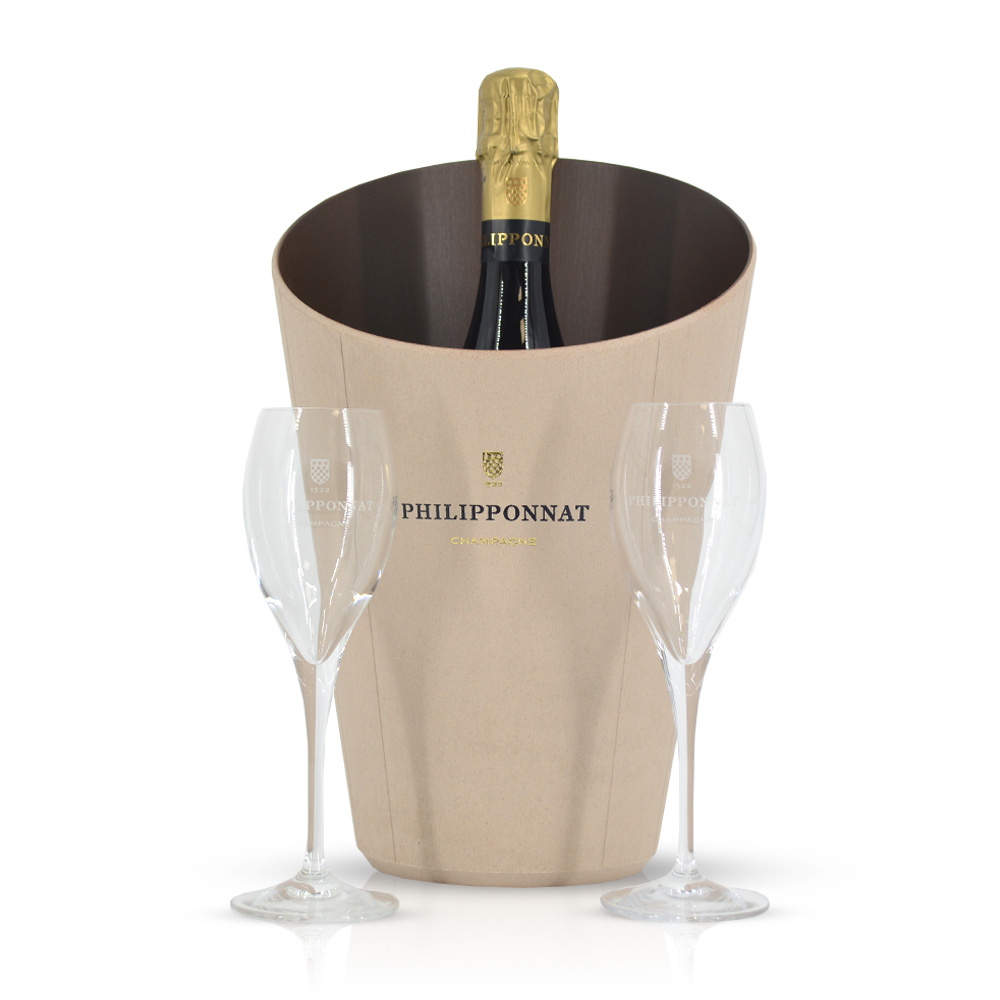 De kristalheldere glazen zijn speciaal ontworpen om elke bubbel tot z’n recht te laten komen, en zijn bedrukt met het stijlvolle logo van Philipponnat. De luxe cooler maakt de set compleet: van buiten warm beige met een chique, bruine lederen look, van binnen diep donkerbruin. Een echte eyecatcher op tafel én functioneel. Samen vormen ze de ultieme set voor liefhebbers van échte champagnebeleving.
